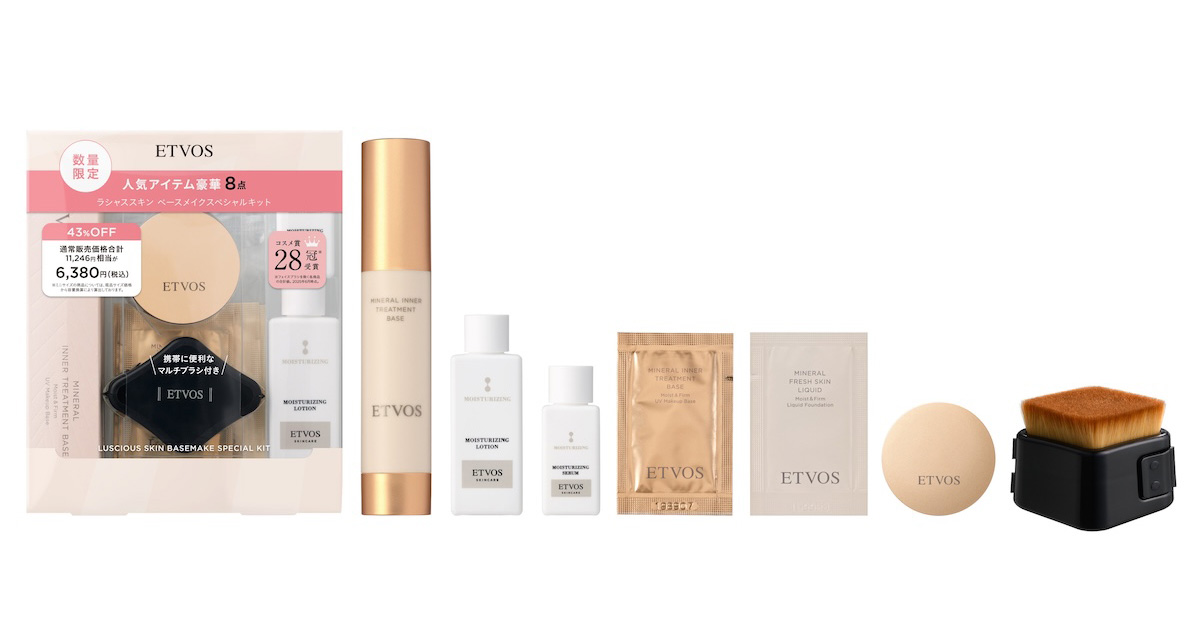 「エトヴォス(ETVOS)」は2026年1月1日、人気アイテムを詰め込んだ“ラシャススキンベースメイクスペシャルキット”(6380円)を数量限定で発売する。公式オンラインストアでは5日に発売する。