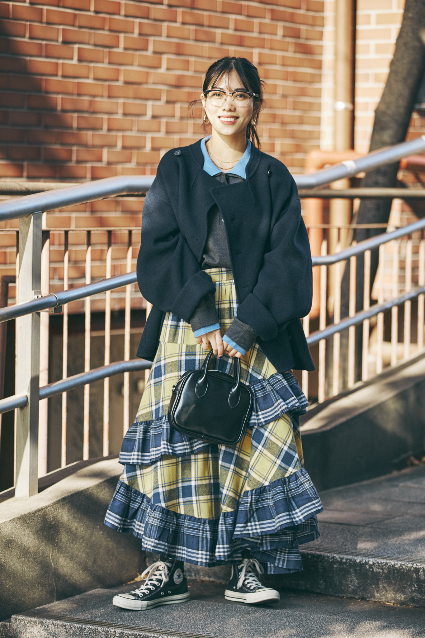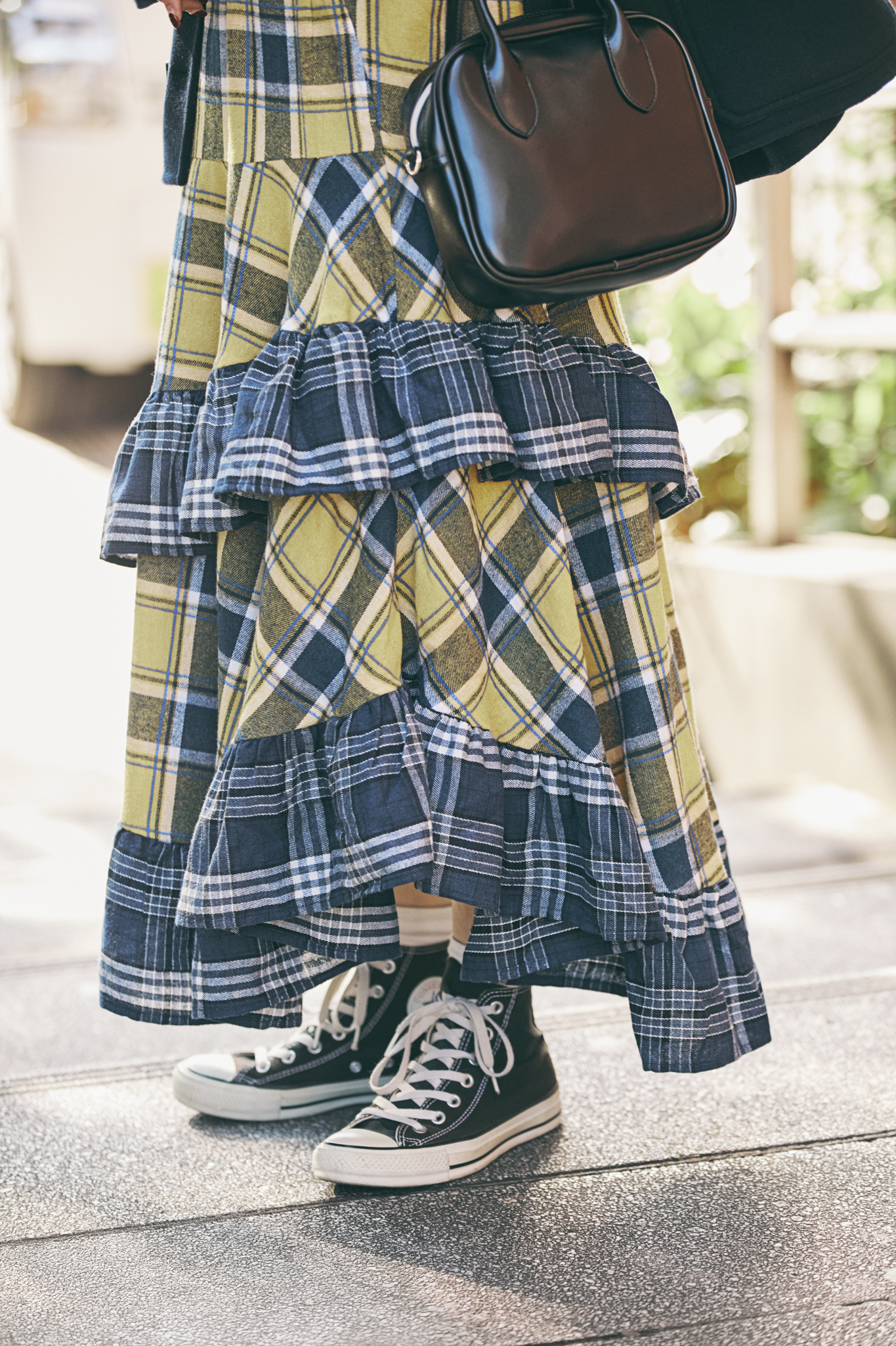 「チェック柄に青が入っているので、配色ニットも青をリンクさせています。バッグと靴をレザーで合わせる王道の組み合わせも素敵ですが、スカートが古着っぽいテイストなので、足もとはコンバースのスニーカーをセレクトしました」。