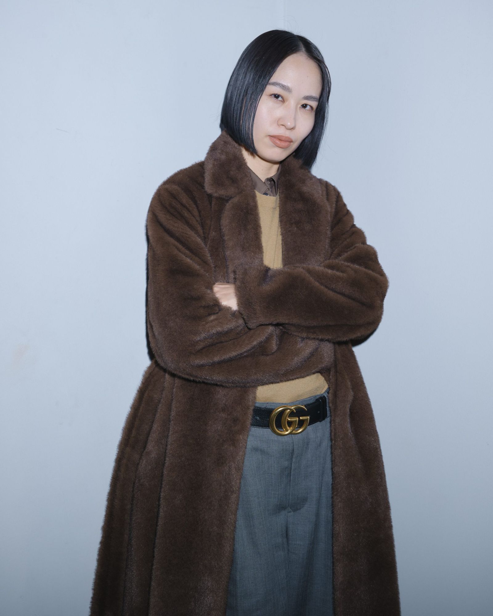 「ホダコヴァ」のコレクションでは、同素材のスカートとのセットアップで提案されていて、黒のベルトで引き締めていたのがすごくすてきだったんです。それを見て、私も黒のベルトを通して着るようにしています。