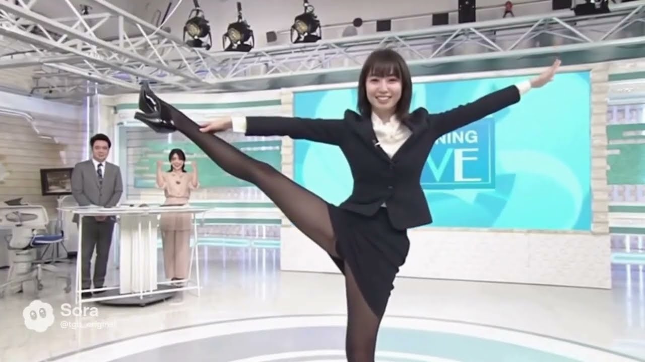 AIが描く30代女性アナウンサーが、スタジオで「Y字バランスチャレンジ」と「10秒逆立ちチャレンジ」に挑戦!