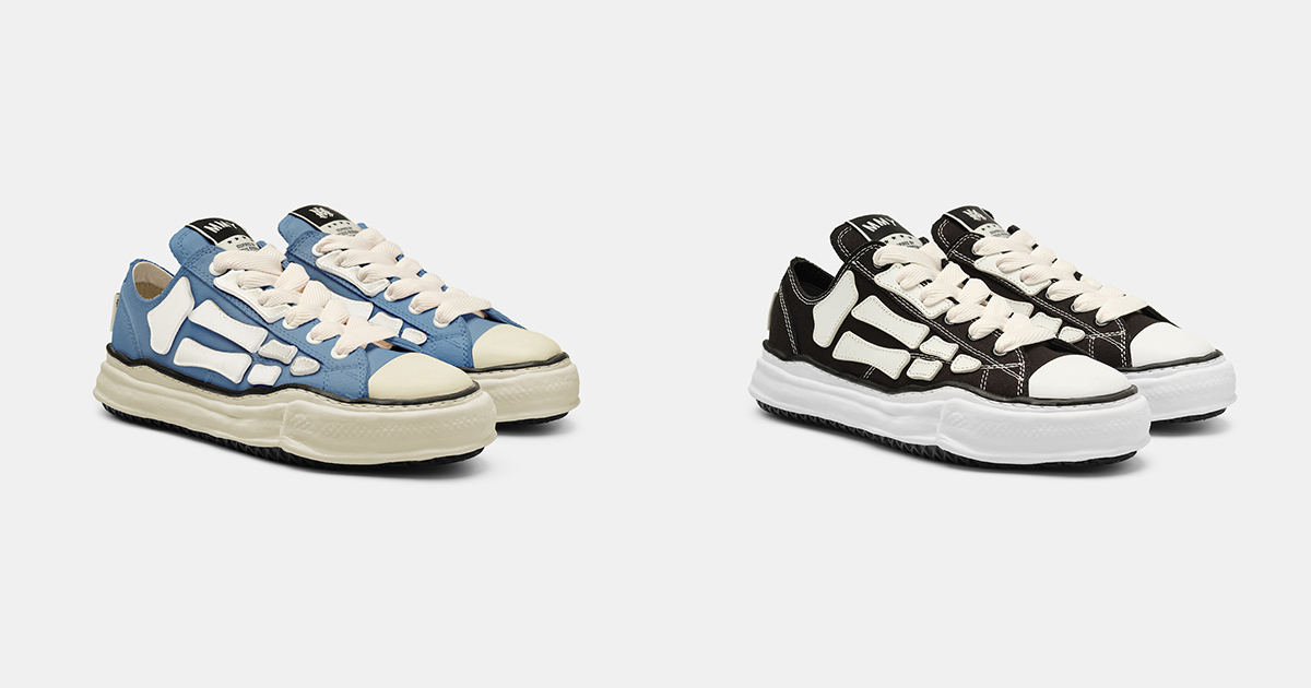 本コラボアイテムは、「アミリ」の“スケル トップ ロー”と「メゾン ミハラヤスヒロ」の“ピーターソン”のシルエットをベースに再構築。「アミリ」のシグネチャーであるナッパレザーの“ボーンズ”ワッペンをキャンバスボディーに配し、「メゾン ミハラヤスヒロ」の粘土を使って手作業で型取ったオリジナルソールと融合した。また、シュータンとヒールにはお互いのブランドロゴを刺しゅうしたウーブンラベルをあしらった。