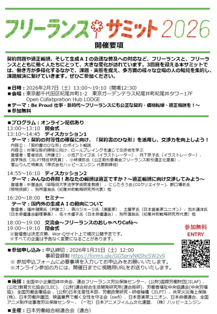 「フリーランスサミット2026」では、あわせて、生成AIが日本のフリーランス、特にクリエイティブな仕事に及ぼす影響と課題について、福井健策氏(骨董通り法律事務所・弁護士)の基調講演を実施するほか、公正な契約や適正報酬についてのディスカッション、「フリーランスのおしゃべりCafé」と題したフリーランス同士の横のつながりや構成組織・地方連合会などとフリーランスをつなぐ場を提供することを目的に交流会を実施します。フリーランスの方、発注する立場の方も含め、多くの方のご参加をお待ちしております。