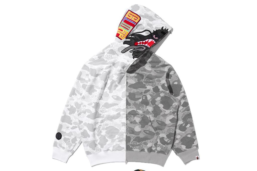 注目は、ア ベイシング エイプを代表するウェア「シャークフルジップフーディー」。中央でカラーを切り替えた、大胆なシルク ロワイヤルとファースト カモのパターンが目を引く。フード部分には緻密な刺繍でドラゴンモチーフをあしらい、力強さと繁栄を表現した。