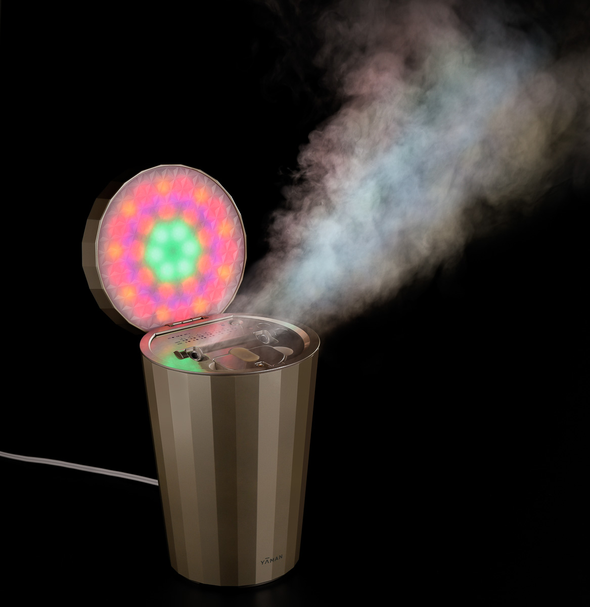 2つの吹出口からは、従来より噴出量が約1.6倍になったWスチームが顔全体を包み込む。7つのモードが選べ、冷ミストや5色LEDの「美肌光」に加え、目元をケアする「アイケアモード」も搭載。