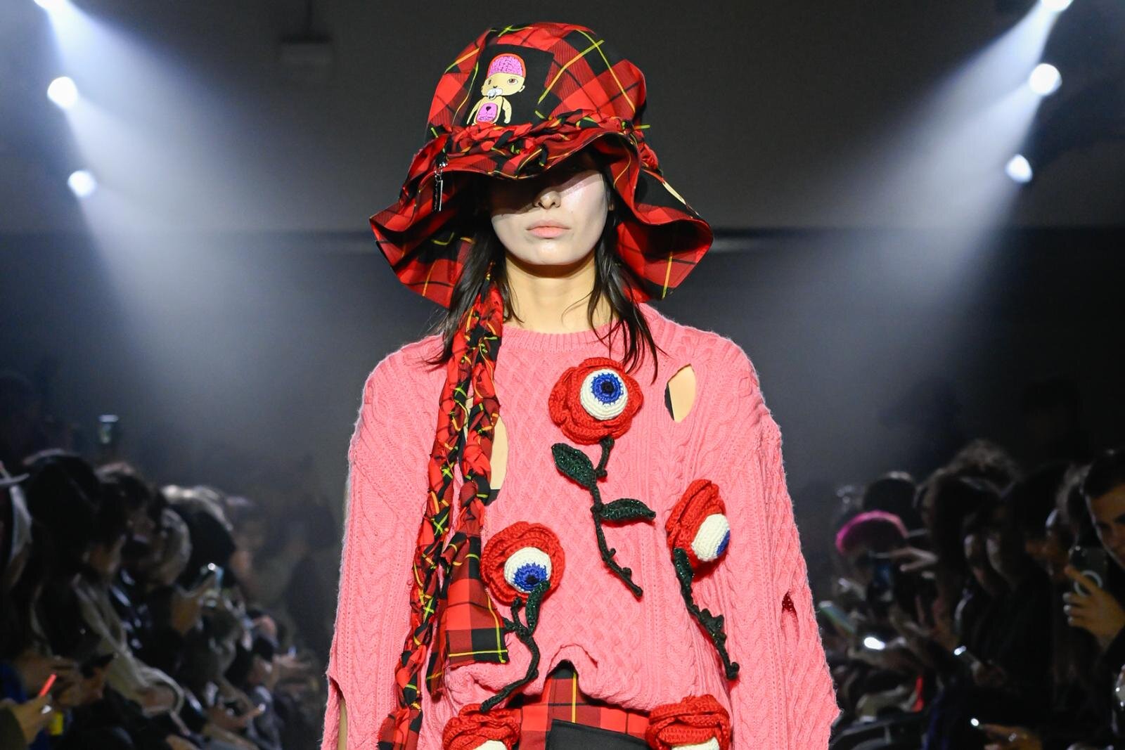 末安自身の居心地のいい方向へと舵を切った今季のキディルは、“HEAVEN”へ導く夢見心地なディテールも随所に差し込まれている。アンブロのウィンドジャケットのフードは腰まで長く伸び、魔導師を思わせる。そして身体を隠すほど大きな天使と悪魔の羽、目玉が咲く薔薇、黒猫の耳や尻尾など、数々のファンタジー性がキディルらしいパンク要素と共鳴している。