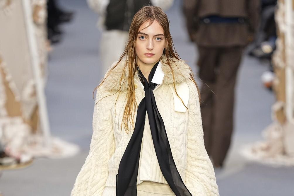 阿部千登勢率いるsacaiの2026年秋冬シーズンは、ブランドのシグネチャーであるハイブリッドの概念をさらに推し進めた「破壊の美」がコンセプト。パンチを繰り出すモハメド・アリに着想を得て、壁を打ち破る、枠に囚われない自由な思考のもと、新たな創造を試みた。