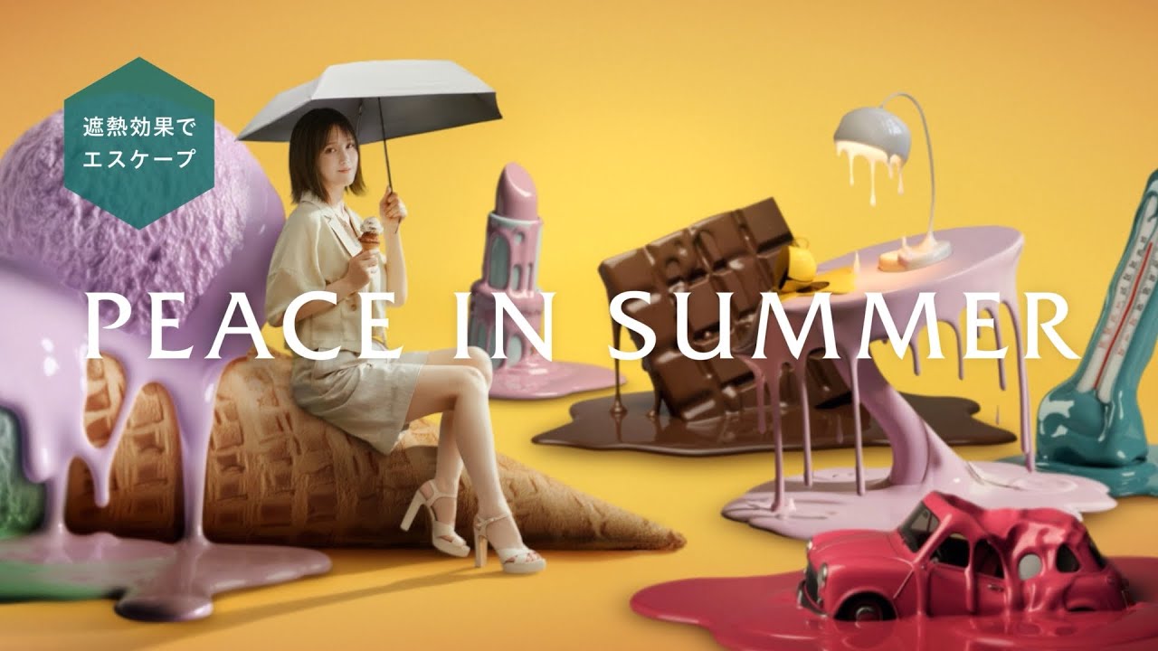 周囲ではチョコレートやアイスクリームがゆっくりと溶け出し、“酷暑の世界”が広がる中で、ふと彼女の視線の先に映るのが「マジカルテック プロテクション」。本田さんが日傘を手に取り広げた瞬間、その場の空気がふっと変わるように、遮熱効果によって日差しが和らぎ、表情は一転して涼しげな表情へ。