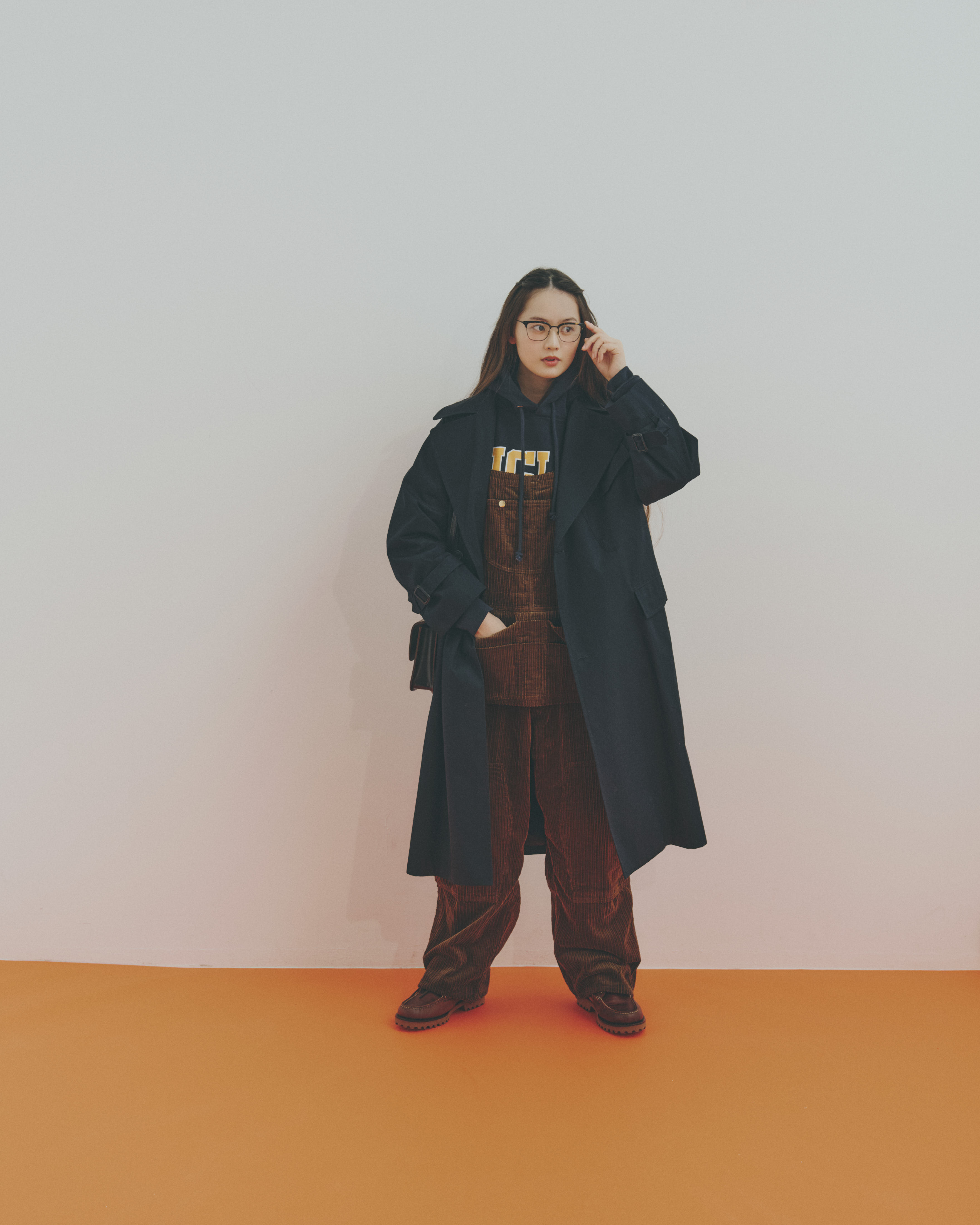 コート¥90200 / BRITISH MADE、バッグ¥78100 / GLENROYAL (ともにブリティッシュメイド 青山本店)、フーディ¥30800 / Champion(ヘインズブランズ ジャパン カスタマーセンター)、オーバーオール¥52800 / MASTER&Co.(マッハ55リミテッド)、メガネ¥84700 / Oliver Peoples(ルックスオティカジャパン カスタマーサービス)、ブーツ¥27500 / L.L.Bean(エル・エル・ビーンカスタマーサービスセンター)