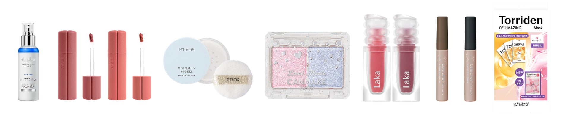 「d`Alba」/リフレッシュアクアスプレーセラム、「hince」/ニュー・ブラーティント※shop in先行、「ETVOS」/ミネラルUVパウダーAZ(スノーホワイト)※shop in限定、「CANMAKE」/ラメマニア、「Laka」/マキシグレイヤーティント#623フロム・マキシグレイヤーティント#624ゴーイング、「Love Liner」/ポンポンカールマスカラ シアーアッシュ・ポンポンカールマスカラ シアーブラック、「Torriden」/セルメイジングビタC&コラーゲンマスク 3+1 パッケージ ※画像左から(イメージ)
