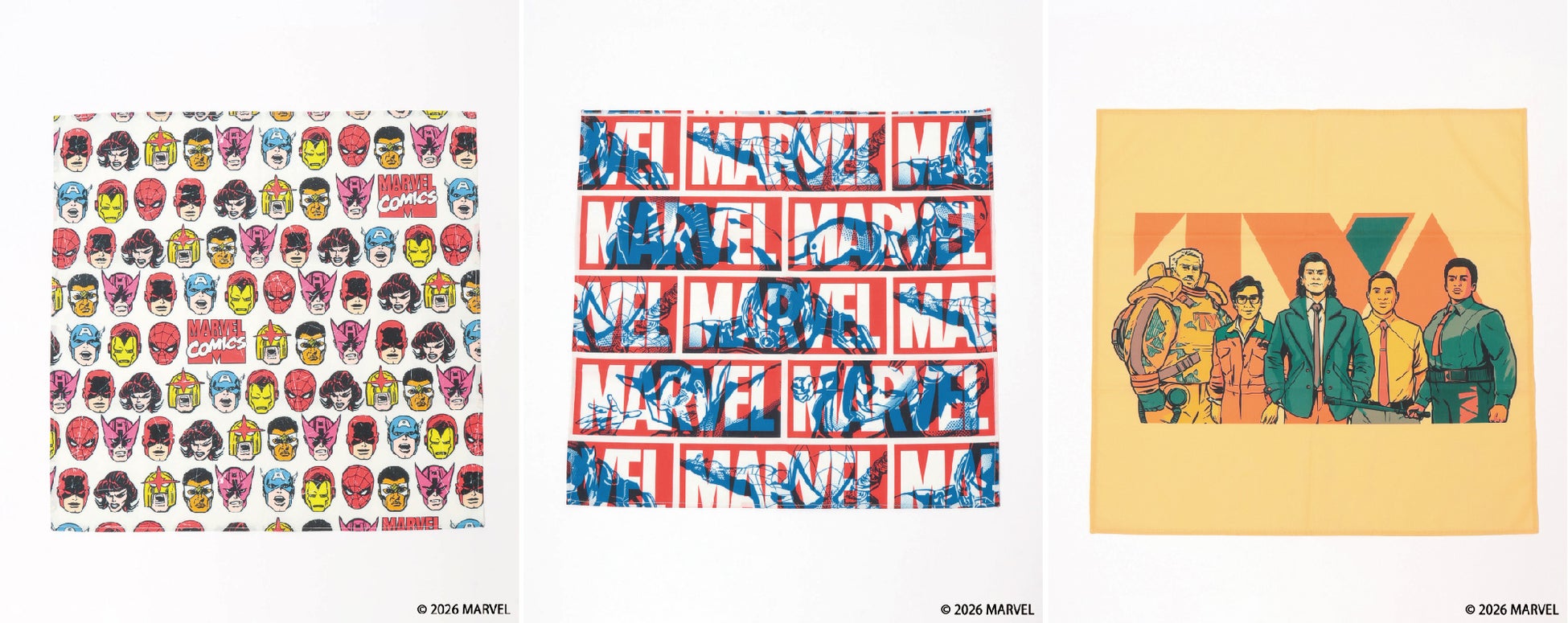 50 ㎝×50 ㎝の大判サイズでマルチに使えるオリジナルの総柄バンダナ。ハンカチとしてはもちろん、スタイリングのアクセントやカバンに巻いたり、お弁当を包むなどマルチに使える万能アイテムです。人気キャラクターのポップなアートや、「ロキ」のカッコよくて渋いアート、『MARVEL』ロゴとヒーローアートがミックスしたデザインなど、アートによって様々な表情が楽しめるのも魅力なアイテムです。