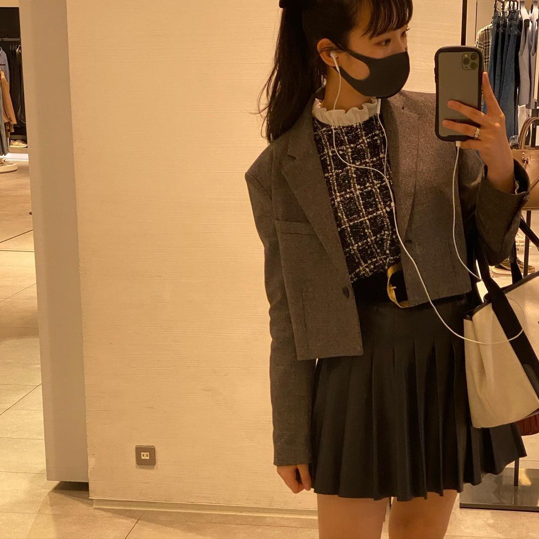 太めのベルトと短いジャケットが可愛い