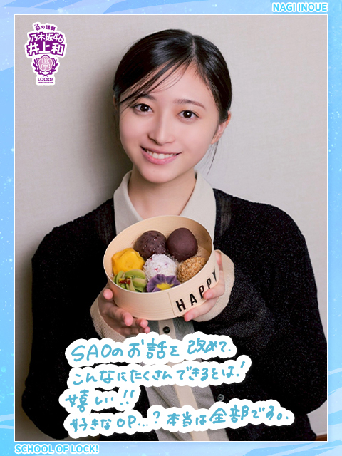 生徒のみなさん、こんばんは。和の講師、乃木坂46の井上和です♡先月の授業の中で、私が大好きなアニメ『ソードアート・オンライン』について私と語り合いたいというメッセージを送ってくれた生徒さんと一緒に電話で熱く語り合ったんですけど、それを受けてなのか、全国のSAOファンの生徒のみなさんからたくさんメッセージが届いておりまして、本当にみなさんありがとうございます!嬉しい~!その中でもこのお話がしたいなと思いまして、メッセージをご紹介させていただきたいなと思います。」
