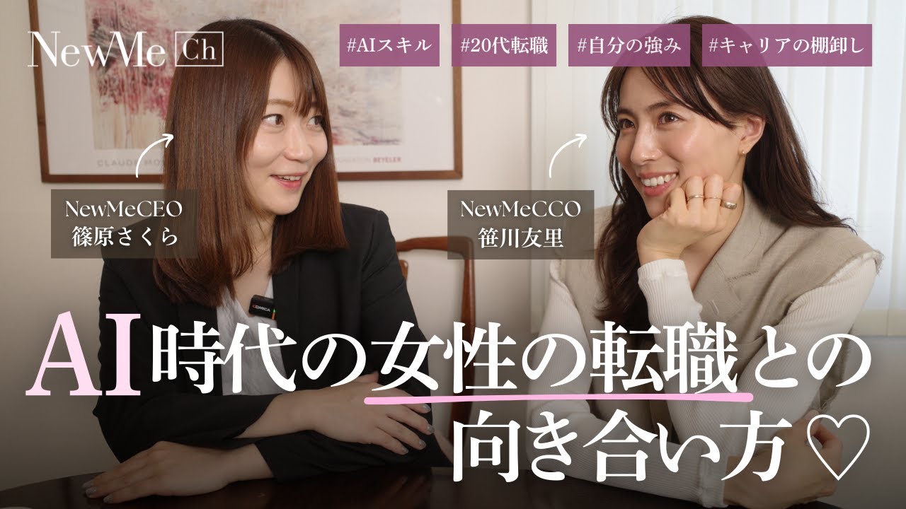 動画では、これまで一貫してHR領域に関わり続けてきたNewMe代表取締役CEO 篠原さくらが、多くの企業や転職候補者と向き合ってきた経験をもとに、AIが時代だからこそ、どのように考えてキャリアと向き合っていけばいいのかをCCOの笹川と対談形式でお話ししています。