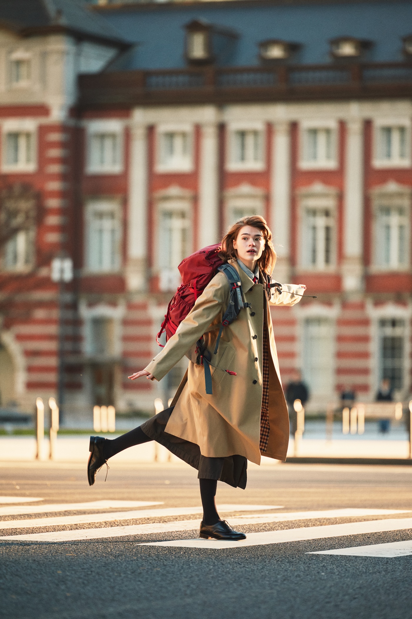 トレンチコートに革靴。定番のクラシックスタイルに合わせたのは、《MILLET(ミレー)》の本格バックパック。たっぷり荷物が入る大容量のバッグは、装いの印象だけでなく行動の幅まで広げてくれる存在。きれいめなスタイルにアウトドアの機能性を取り入れることで、街歩きから小旅行まで自然に楽しめる装いに。鮮やかな赤を選べば、パリジェンヌらしい軽やかな華やぎが生まれる。