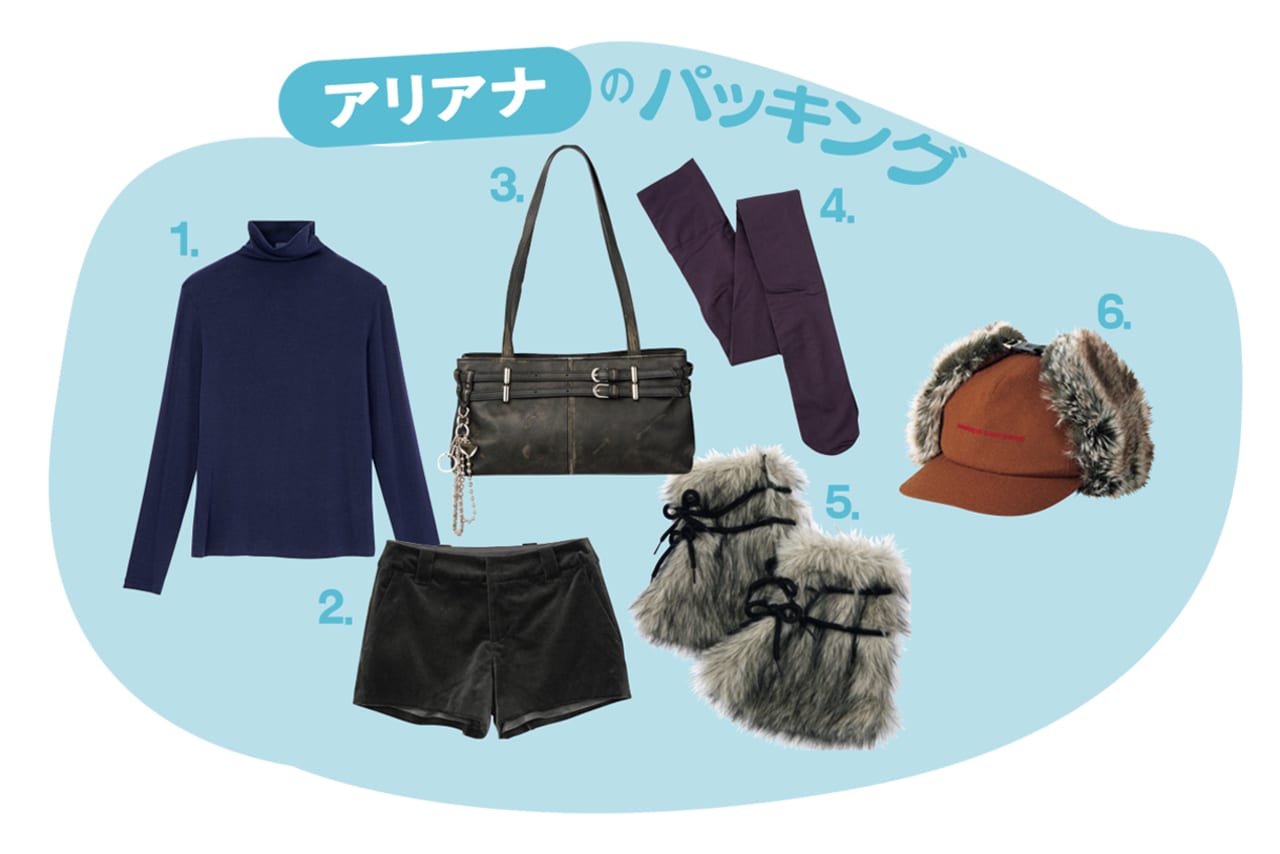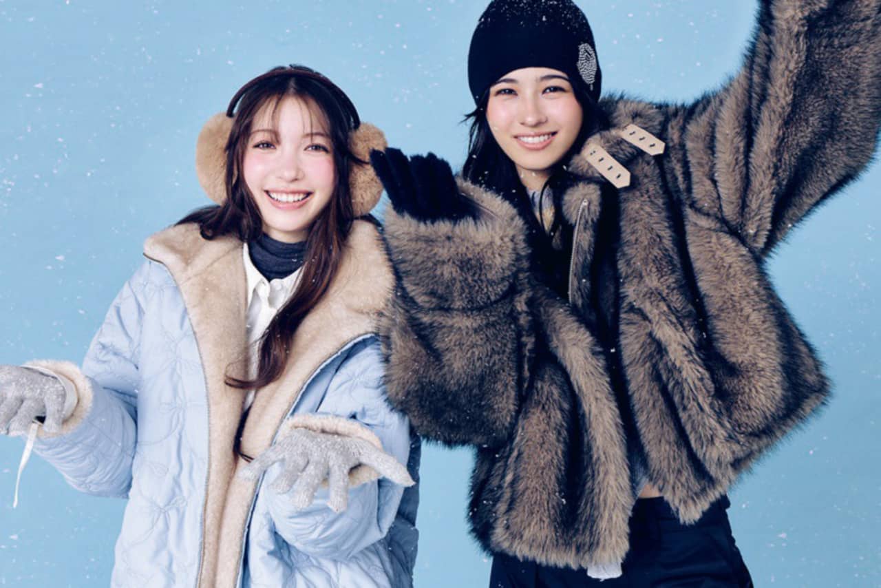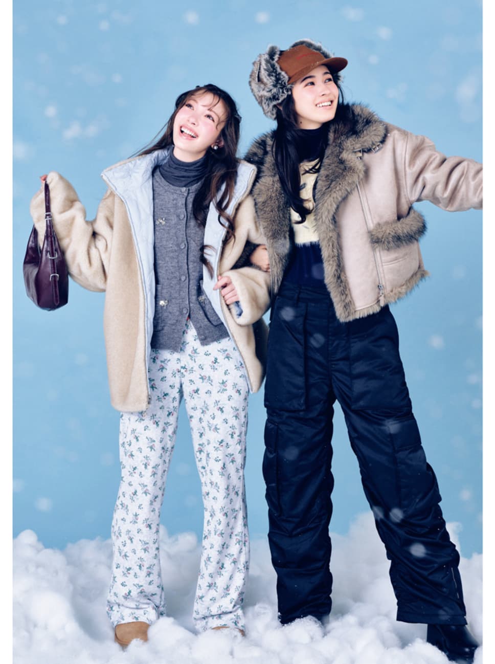 【左・サクラ】フェイクファーキルティングリバーシブルコート¥20900/CALNAMUR デザインシャツ¥6930/EMODAルミネエスト新宿店 ヒートテックタートルトップス¥2290/UNIQLO(UNIQLO : C) 花柄パンツ¥16600(MINJIENA)、ドット柄ショルダーバッグ¥14540(ENZOBLUES)、バッグに付けたキーリング¥5100、バッグに付けた星柄チャーム¥3960(YEOMIM)/HANAKOREA イヤーマフ¥5500/OVERRIDE ルミネエスト新宿(OVERRIDE) グローブ¥3490/Gap ムートンブーツ¥30800/デッカーズジャパン(UGG®) 【右・アリアナ】フェイクファームートンリバーシブルジャケット¥18800/EVRISルミネエスト新宿 ニットの短丈トップス&ロングトップスのセット¥16500/バロックジャパンリミテッド(SLY) ダウンパンツ¥20600/NIKE カスタマーサービス(NIKE SPORTSWEAR) ニット帽¥16500/BAPE STORE® 原宿(ABATHING APE®) グローブ¥7150/Carhartt WIP Store Harajuku(Carhartt WIP) ボストンバッグ¥16500/アメアスポーツジャパン・ウイルソンお客様センター(ウイルソン) カバーブーツ¥14960/R&E ●商品情報はViVi2026年2/3月号のものです。