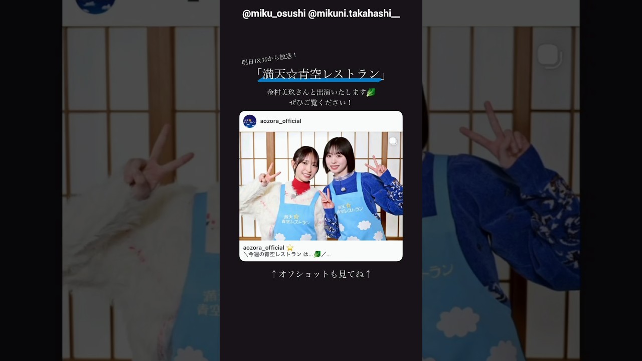 金村美玖 髙橋未来 本日1月31日18:30~日本テレビ『満天 青空レストラン』に出演します!