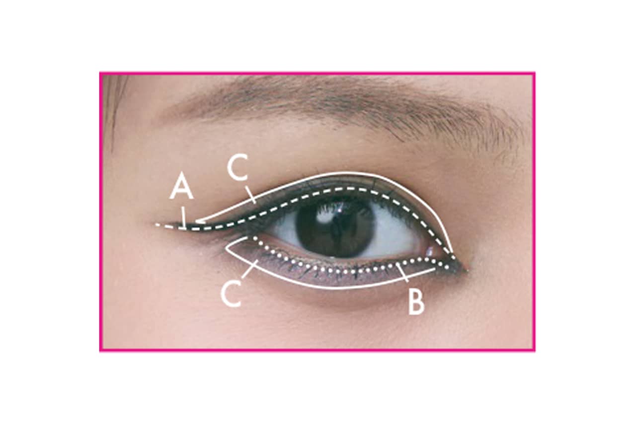 【B】を二重幅にぼかしたら、【A】で上まぶたのキワ全体〜目尻長め+下まぶたのキワにラインを引き、下ラインだけ【B】でぼかす。さらに【C】で上下ラインをぼかし、目尻の三角ゾーンも埋める。