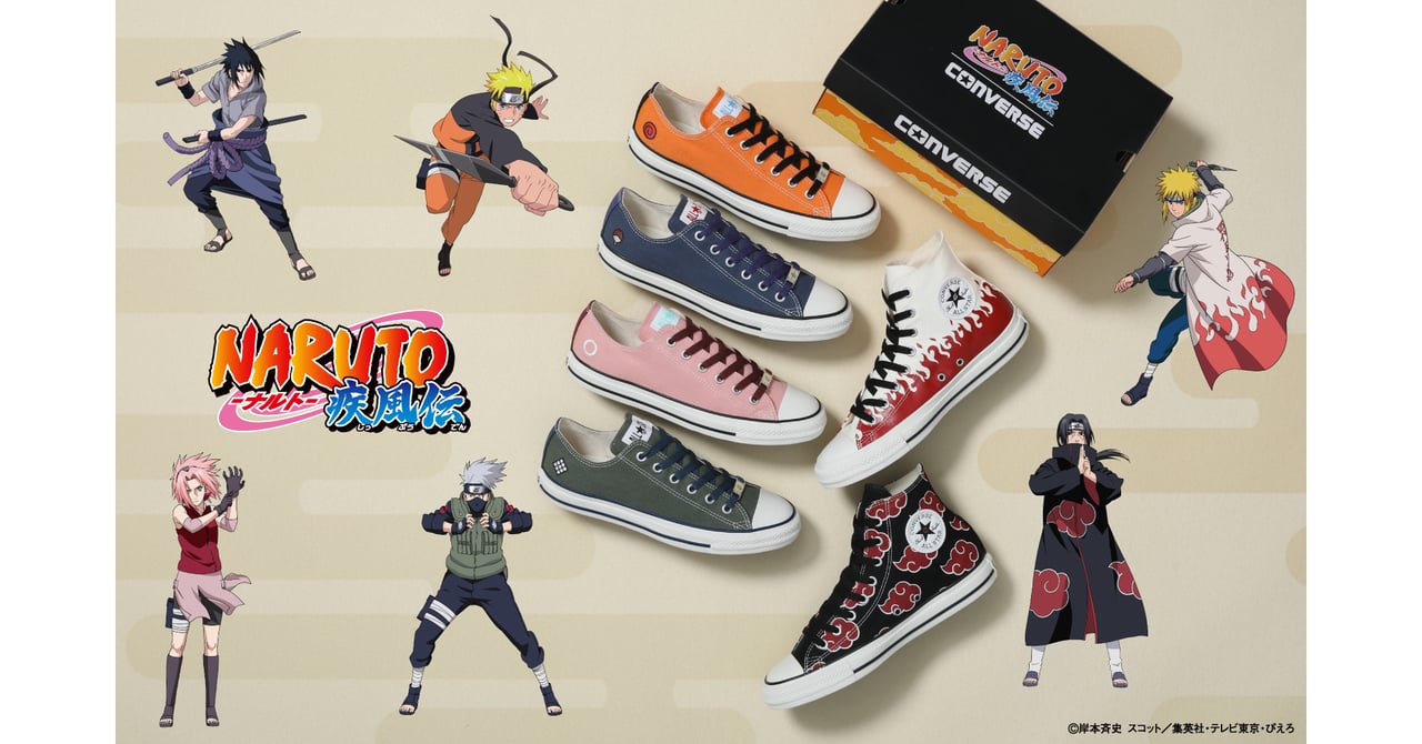 コラボは、「オールスター(ALL STAR)」をベースにしたローカットモデルの「ALL STAR OX / NARUTO SHIPPUDEN」(1万2100円)と、ハイカットモデル「ALL STAR HI / NARUTO SHIPPUDEN」(1万4300円)の計2型で構成。各モデルには快適な履き心地を追求したリニューアルスペックを搭載したほか、ヒールラベルやインソールには、限定のオリジナルグラフィックを採用。作品の世界観とオールスター(ALL STAR)の普遍的なデザインを融合させた。