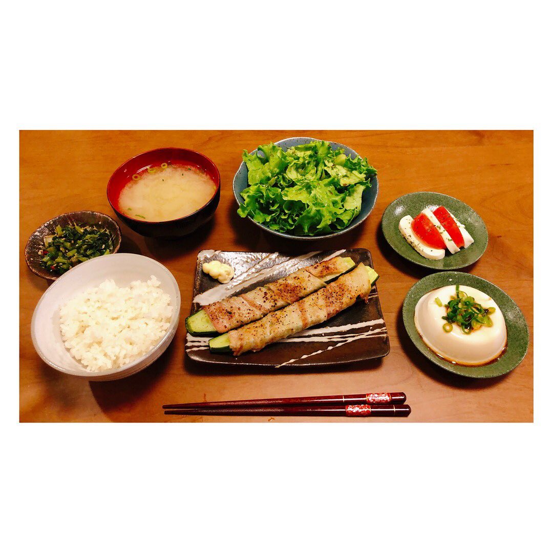 . 今日は胡瓜の豚肉巻き🥒 昔から胡瓜大好きだけど 焼いたのは初めて! 縦半分に切って、塩胡椒たっぷりして 250°のオーブンで17分焼きました👩🏻🍳 仕上げにレモン絞って完成✨ (ポッカレモン笑) 青臭がなくなってジューシーで めちゃうまでした😚 . 最近は、体重も安定してきたので バランスいい定食を食べてます♪ あったかくなってきたし 気分もあがるね♡♡♡ . #晩御飯 #riho_asaka#朝香りほAsaka RihoRiho Asaka晩御飯