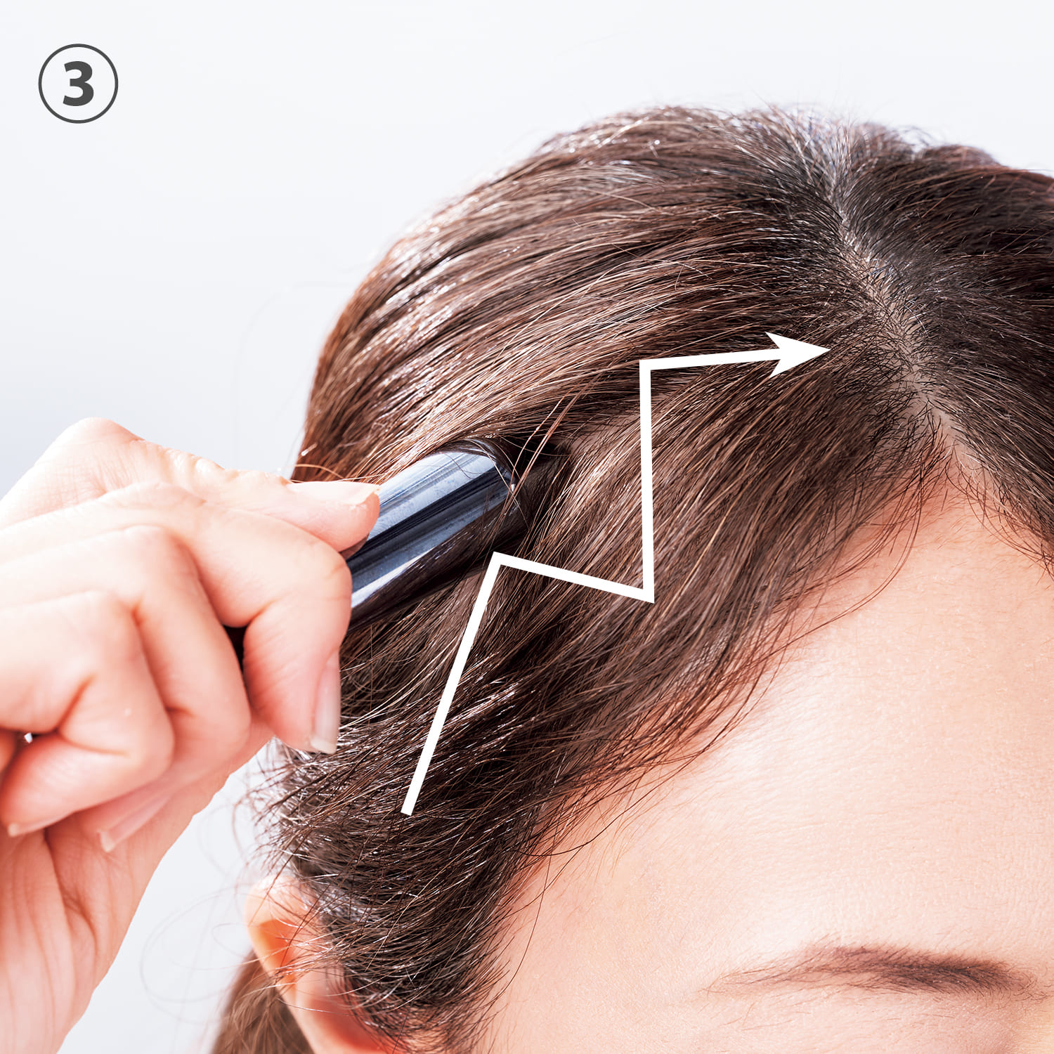尖った部分で耳の上から、側頭部をジグザグとかすように頭頂部へ。引き上げるイメージで左右5回ほど。