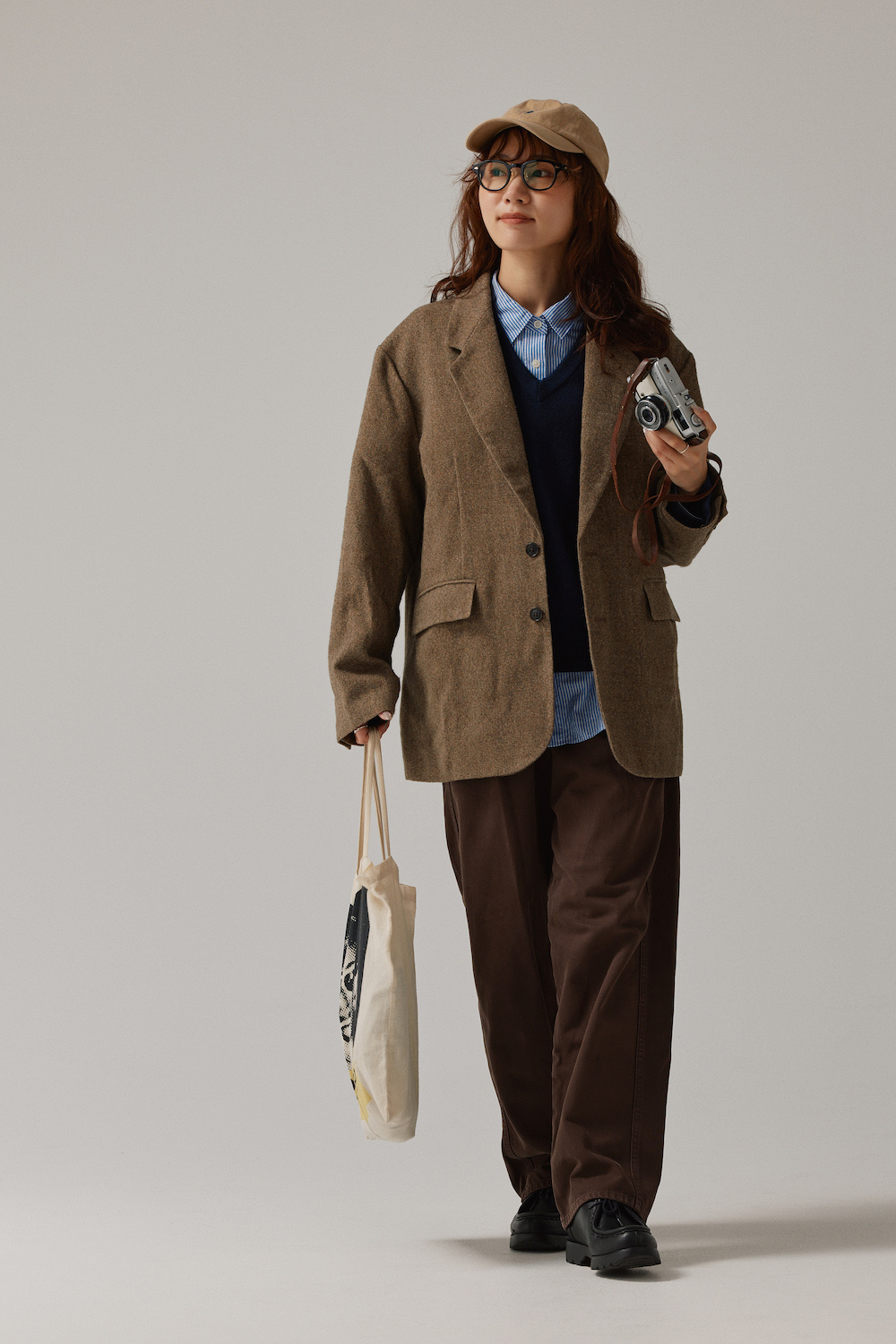 「ブラウン×ブルーで作るコーディネートは、マイトップ3に入る組み合わせ。去年から、気づけばこの色合わせばかり!今日は、ゆるめに着られるメンズのテーラードジャケットを軸にして、こんな着こなしにしてみました。中は、ジャケットのトラッドな雰囲気と好相性な、ストライプシャツ&Vネックニットを重ねて。ツイードジャケットは、冬から春へと向かう三寒四温の時季には、コートなしでもそれに代わる暖かさがあるので重宝します。大きめサイズなら中にたくさん着られるしね!さて、最近行けてないカフェの開拓をしに行ってきます!」