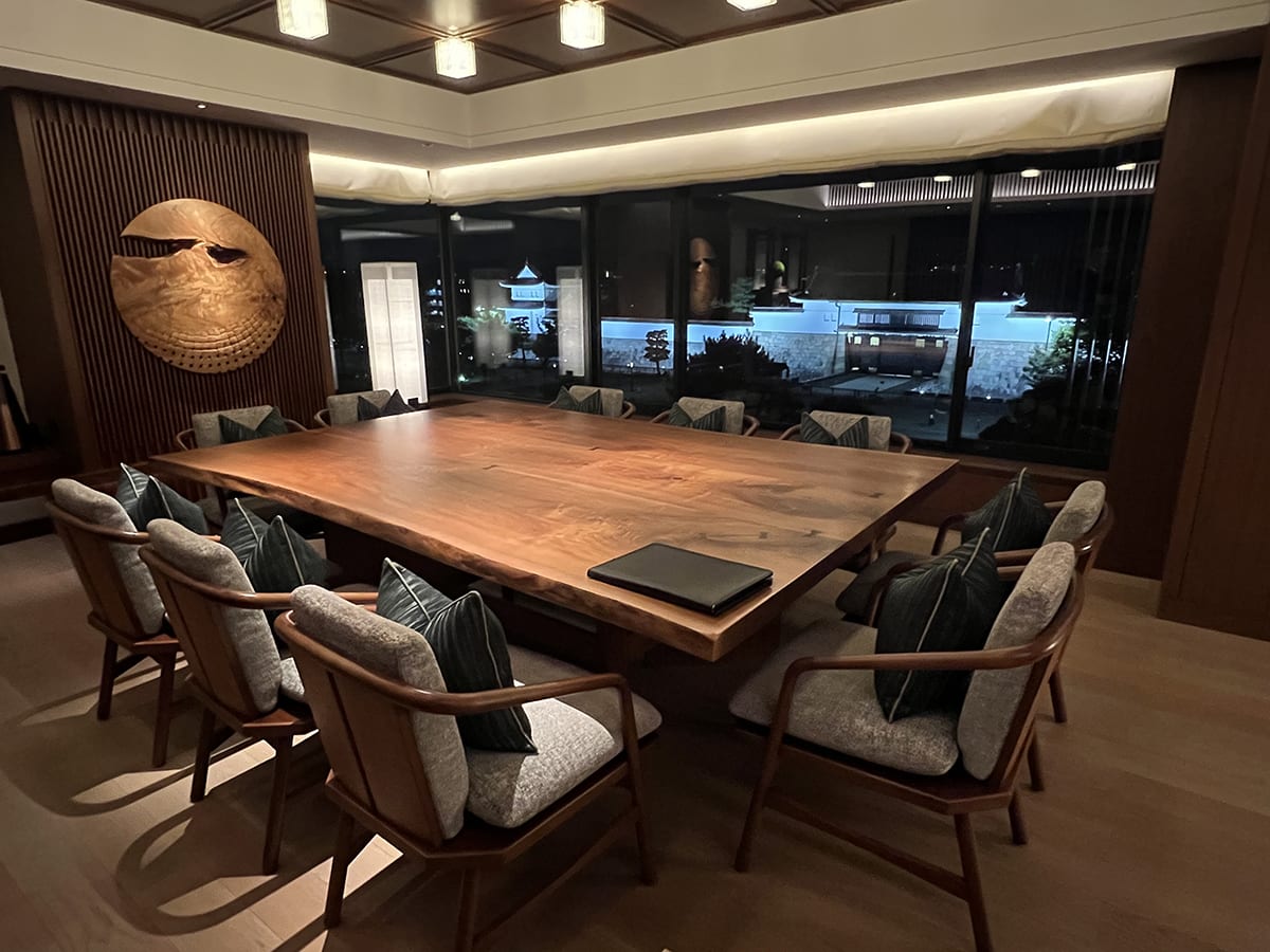 すっかり満たされてプライベート温泉のあるスパエリア「サーマルスプリングSPA」を出て、THE MITSUI館内をそぞろ歩く。ラウンジの天井から吊り下げられたパイプアートも、床から天井まである巨大な窓越しに見える回遊式の中庭やホテルの建物も、すべてがライトアップされて、ただただ美しい。