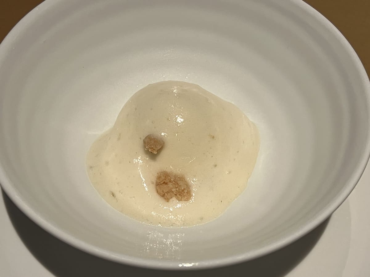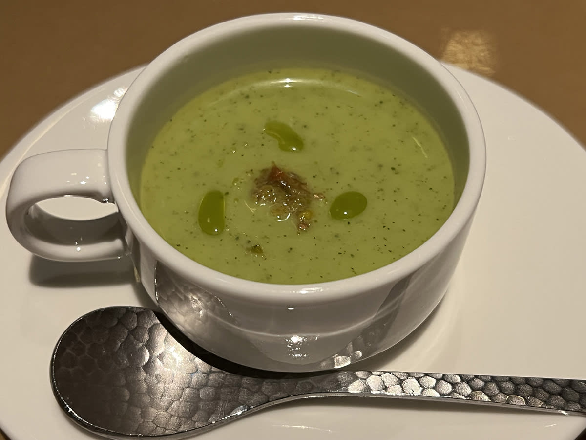 この日(メニューは時期により替わる)、まず出てきたのは、スープ「ズッキーニのポタージュ ミントとスパイス」。どうですか、この美しさ! 舌が焼けるほどアツアツだけれど、夢中で飲み干しちゃうくらいおいしい! ミントやスパイスの香りは効果的だが、きわめて上品でズッキーニのフレーバーをジャマしない。そして、そのあとの料理でも、うるわしい見た目と極上の味に驚かされることになる。