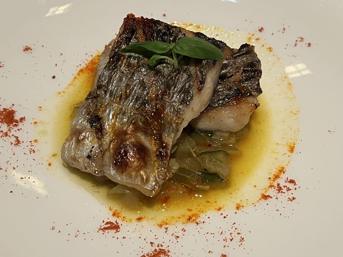 3品目「太刀魚の炭焼き アーティチョークの軽い煮込み」。皮がパリッ!の太刀魚、旨し。
