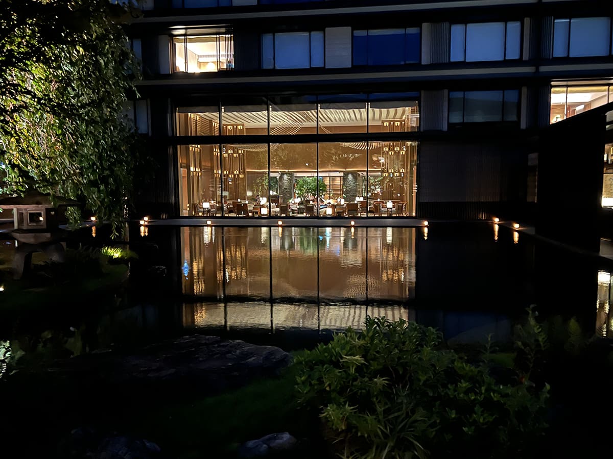 いやー、満腹、満足! 「こんな旨いイタリアン、いままで食べたことあったかな?」と思えるくらいのディナーだった。しかもこのレストラン、どの席に座っても中庭がよく見えるように工夫されている。窓際の座席は低い位置に、奥の席は高い位置にと、うまく段差がつけられ、奥の席からでも余裕で庭が見通せる。いて、たとえ庭に背を向けた席に座ることになっても、店の奥の壁は一面鏡になっているから、そこに映った庭を望める。さすが、THE MITSUIのホスピタリティ!