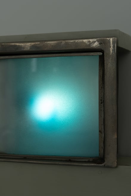 会場には、グレイが1930年頃にパリ・ボナパルト通り21番地の自らのアパルトマンのためにデザインした実際のベッドと書棚の家具作品を設置。本を読むためのライトの角度、温かいお茶を置くための小さな引き出しといった、外の世界から切り離され、自分だけの時間に浸るための細やかな工夫が詰め込まれている。モダンな建築資材を思わせる、ほのかに青みがかったグレーのトーンに統一し、ベッドルームとコレクションを展示するラックが対となるように配置した。