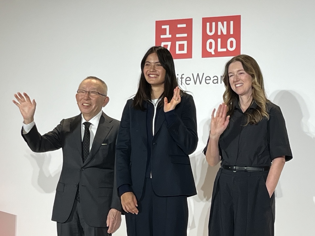 記者発表会に登壇した(左から)ファーストリテイリングの柳井正社長、女子テニスのエマ・ラドゥカヌ選手、「ユニクロ」のクレア・ワイト・ケラー=クリエイティブ・ディレクター(2月24日午前、東京・有明)