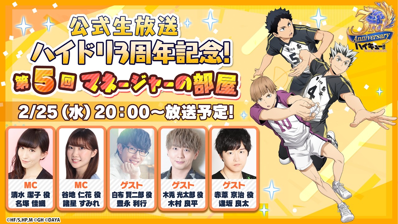 アニメ『ハイキュー!!』の大人気スマートフォンゲーム『ハイキュー!! TOUCH THE DREAM』略称『ハイドリ』がリリース3周年を記念した生放送を配信!
