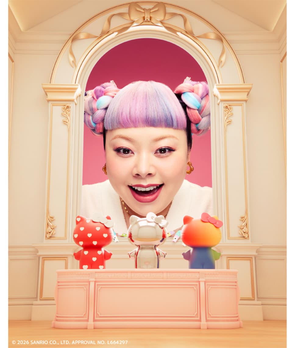 左から・THE HELLO KITTY【pattern】¥19800 Kawaii² HELLO KITTYフィギュア¥4950 【オフィシャルストア限定】シナモロールぬいぐるみ LLサイズ¥33000 ●商品情報は2026年2月時点のものです。