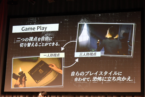 一人称視点と三人称視点が切り替えられるようになった点について中西氏は、一人称視点は怖いという人もいて、三人称視点だとキャラクターが映っていると少し安心感があるので、プレイして怖かったら三人称視点にしてもらえれば“ちょっとマシ”になるとコメントした。