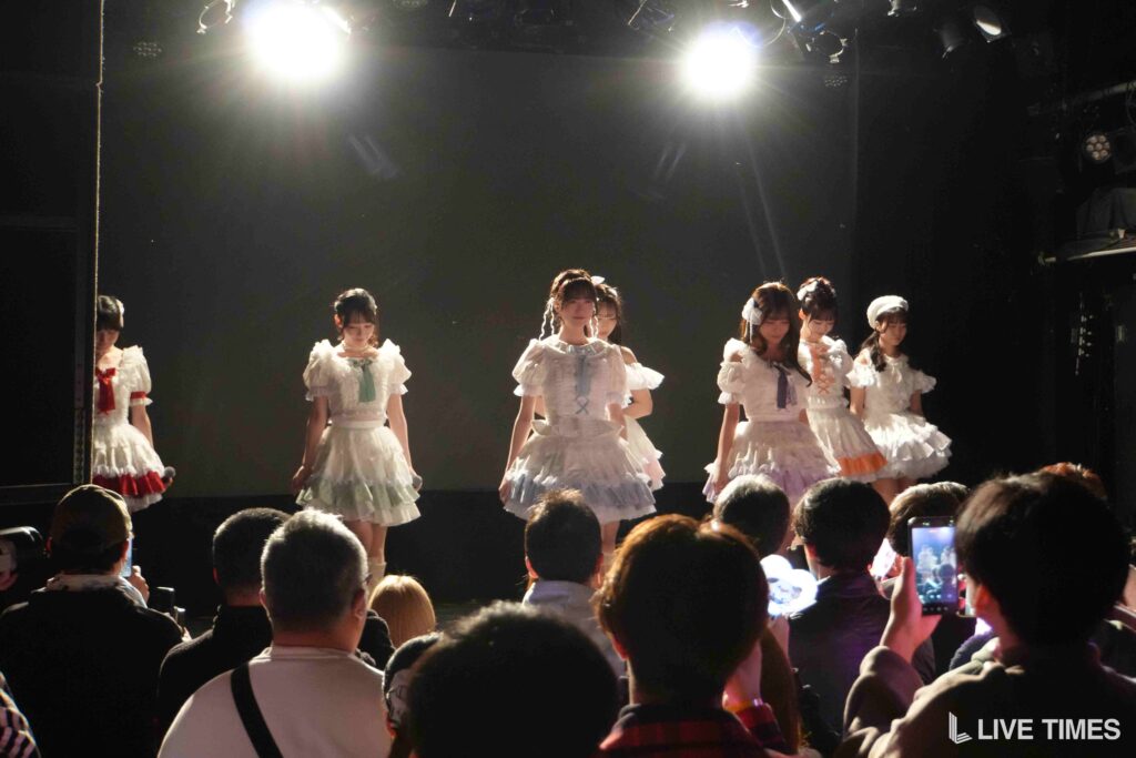 開演前のアナウンスでは、「全編、撮影OKです。たくさん撮って、思い出をたくさん残してくださいね!」と伝えられ、ファンは一斉にスマートフォンやカメラを準備。さらに、「5期からメンバーカラーが決定しました。推し色を振ってくれたらファンサが飛んでくるかも? 今日という瞬間を、1番かわいい私たちで彩ってください」とアナウンスされると、フロアのボルテージは一気に上昇した。