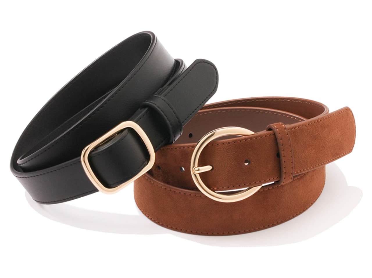 【左】スクエアホールレスベルト、【右】サークルバックルワイドベルト各¥1290/GU ●商品情報は2026年3月時点のものです。