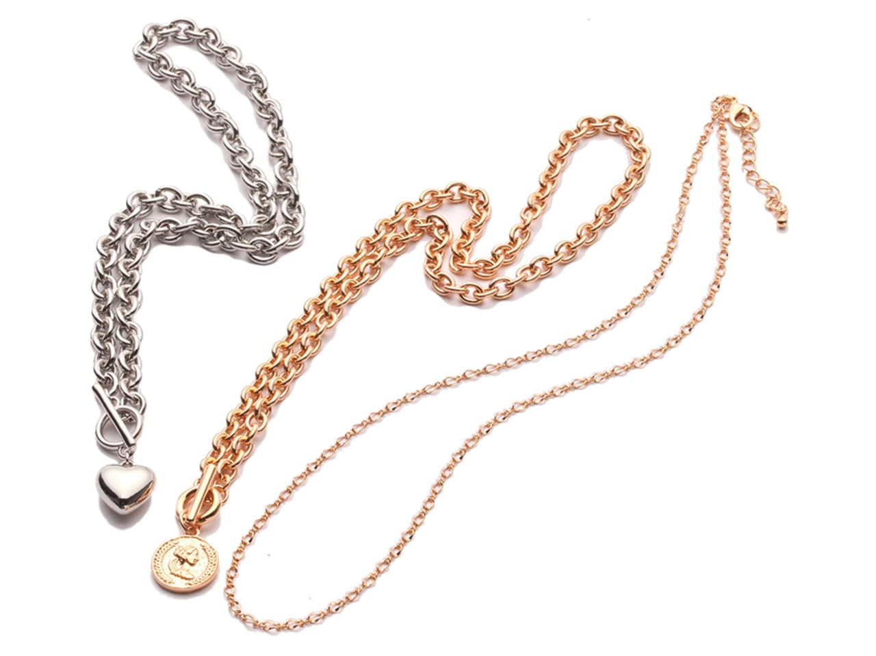 【左】ハートモチーフボリュームチェーンネックレス、【右】メタルコインネックレス各¥590/GU ●商品情報は2026年3月時点のものです。