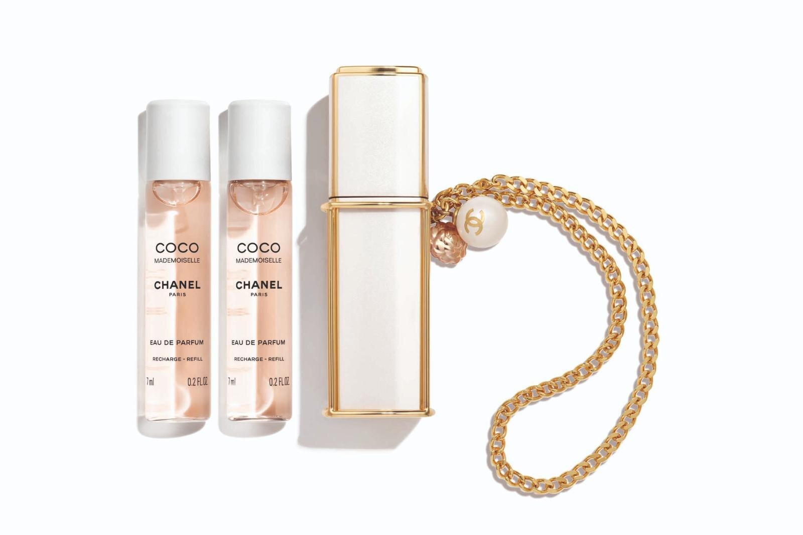 ポイントとなるのは、ダブルCロゴがあしらわれたパールとゴールドに輝くカメリアチャーム。ケースとともに、7mLサイズのフレグランスが3本セットになっているので、入れ替えて長く愛用できるのが嬉しい。