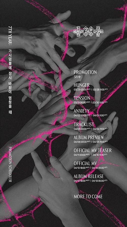 公開されたプロモーションスケジュール画像は、メンバーの手が絡み合い、その間に蛍光色の棘の茂みが伸びているデザイン。これによると、3月29日から4月2日にかけて「HUNGER」「TENSION」「ANXIETY」のコンセプトフォト、4月5日にトラックリスト、4月6日にアルバムプレビュー、4月11日にリード曲のMVティーザー、4月13日18時にミニアルバムの音源とリード曲のMVが公開。また、リリース日の20時には、韓国の高麗大学ファジョン体育館でカムバックショーケースが開催される。