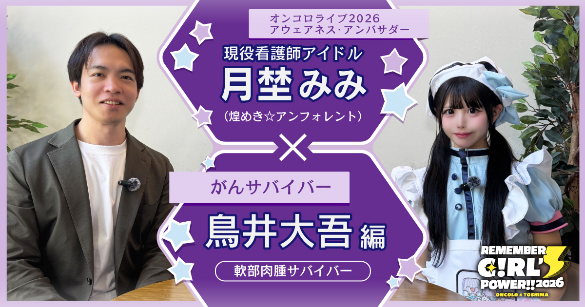 オンコロライブ2026のアウェアネス・アンバサダーを務める月埜みみさん(煌めき☆アンフォレント)が、がんを経験した方々の「その後の人生」に向き合うインタビューシリーズ。第3回目のゲストは、AYA世代で軟部肉腫を経験した鳥井大吾さんです。