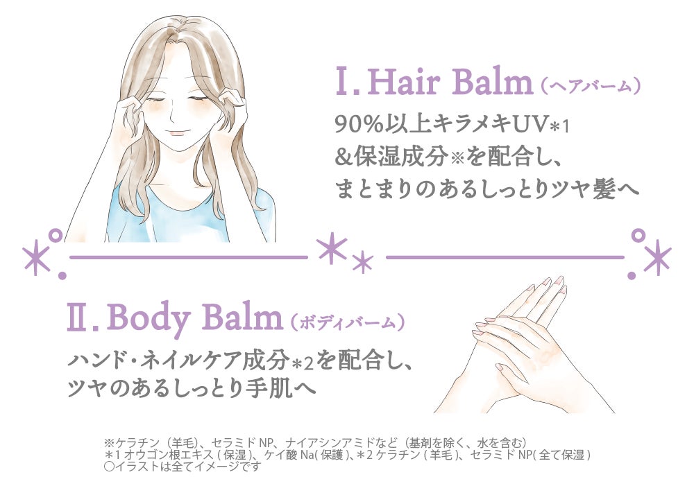 晴れの日対策として、 UV対策※1成分*1を配合し、外出時の髪と手肌を360度バリア&コート。輝き髪の基礎を整えます。