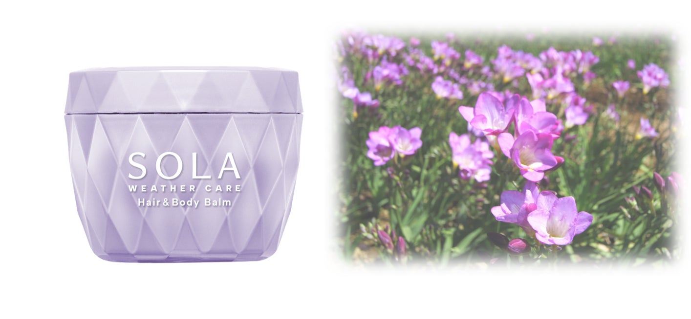 「SOLA WEATHER CARE」は、「ウェザーケア美容」に着⽬した輝く晴れツヤ髪へ導くヘアケアブランドです。新発売の「ソラウェザーケアクリスタルヘア&ボディバーム」は、体温でとろけるバームを髪になじませるだけで、まとまりのあるしっとりツヤ髪に仕上がります。⼿に残ったバームはそのまま乾燥しやすい指先やひざなどの保湿としても使⽤可能なヘア&ボディ⽤バームです。