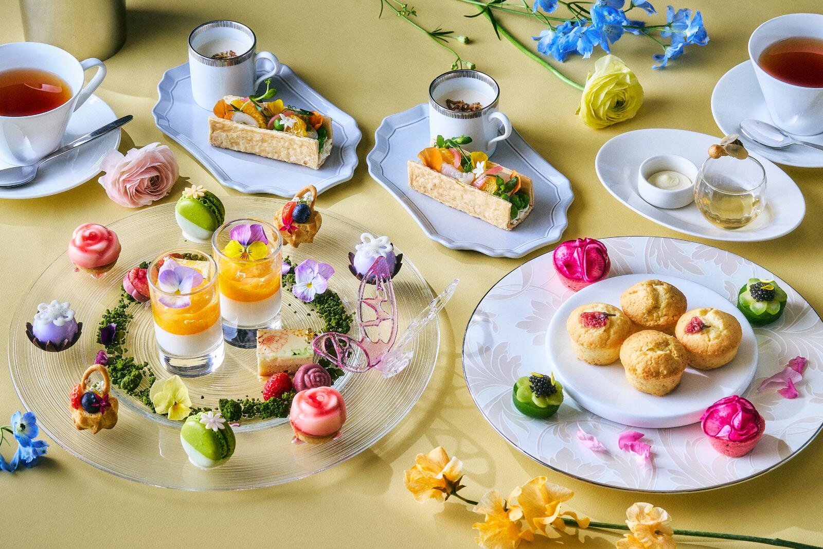 プレートには、色とりどりの花々をイメージしたスイーツ&セイボリーがずらりと並び、まるでフラワーガーデンのよう。飴細工の蝶やシュー生地のミツバチが舞う、遊び心あふれるトッピングにも注目だ。