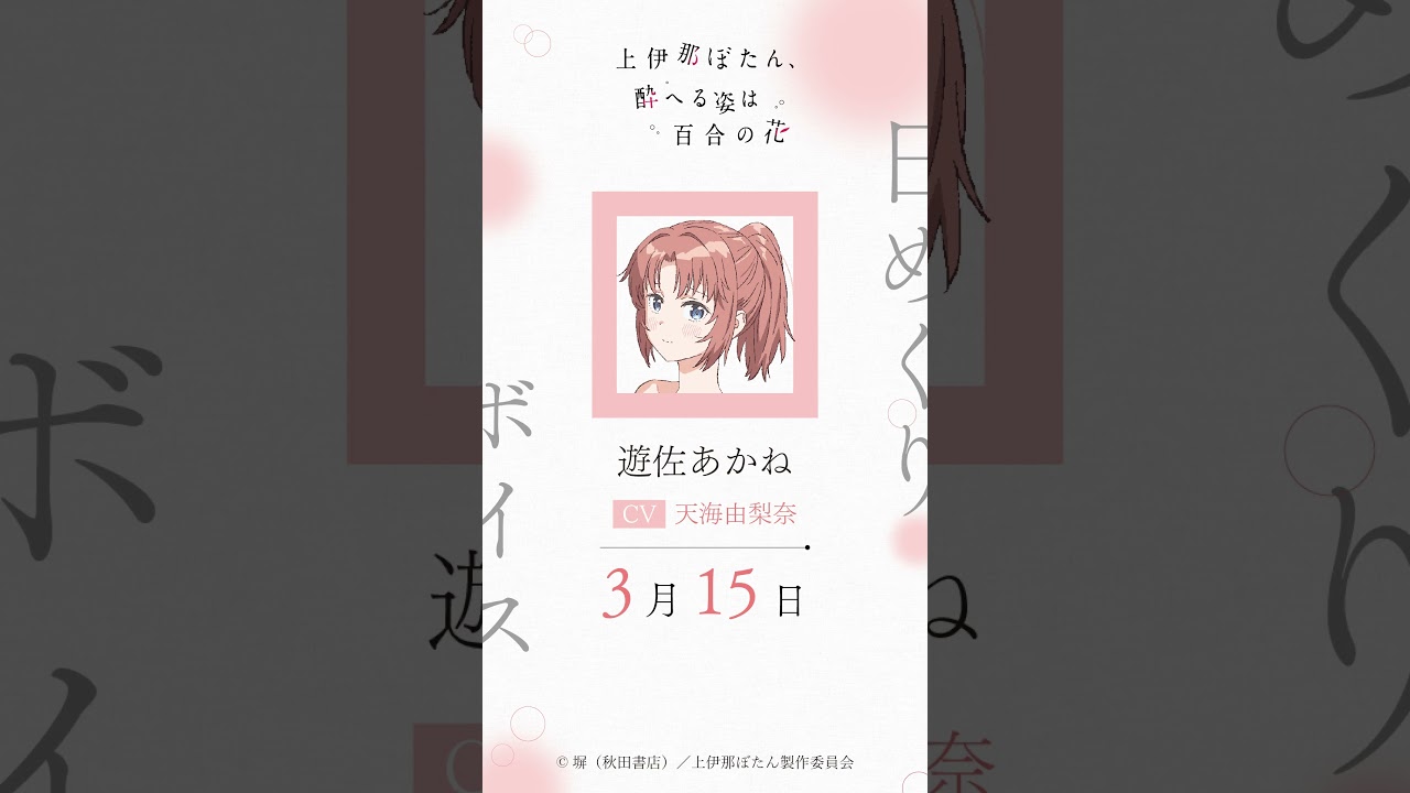 あかね(CV #天海由梨奈 )の日めくりボイス:3月15日|TVアニメ『上伊那ぼたん、酔へる姿は百合の花』#上伊那ぼたん female voice actorsvoice actorsvoice actresses声優天海由梨奈女性声優 Write A Commentコメントを投稿するにはログインしてください。