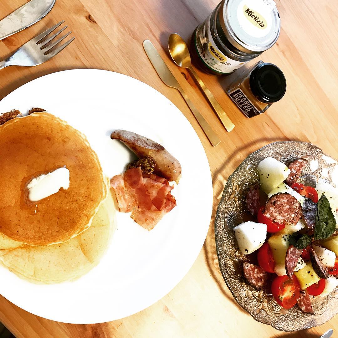 ブランチ🍯🐝🌸 グルテンフリーパンケーキ ソーセージ ベーコン 実はメインは 梨とメロンとトマト🍐🍈🍅とハーブドライサラミのサラダ🥗 味付けはオリーブオイルとアボカドオイルと塩、ブラックペッパー! #ぱいるめし #blunch #ブランチ #cooking #pancakes #eriko_hori#Pile#堀絵梨子blunchcookingEriko HoriHori Erikopancakesぱいるめしブランチ