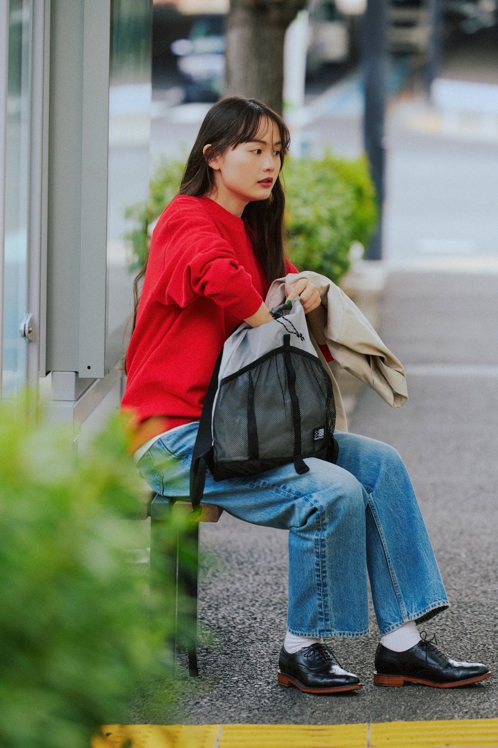 スウェットシャツ¥3157/United Athle(キャブ)、デニムパンツ¥34100/THE SHINZONE(シンゾーン ルミネ新宿店)、手に持ったジャケット¥38500/ANATOMICA(アナトミカ 東京)、バックパック¥8000/KARRIMOR(カリマーインターナショナル)、シューズ¥42900/REGAL(リーガルコーポレーション)、ソックス/スタイリスト私物