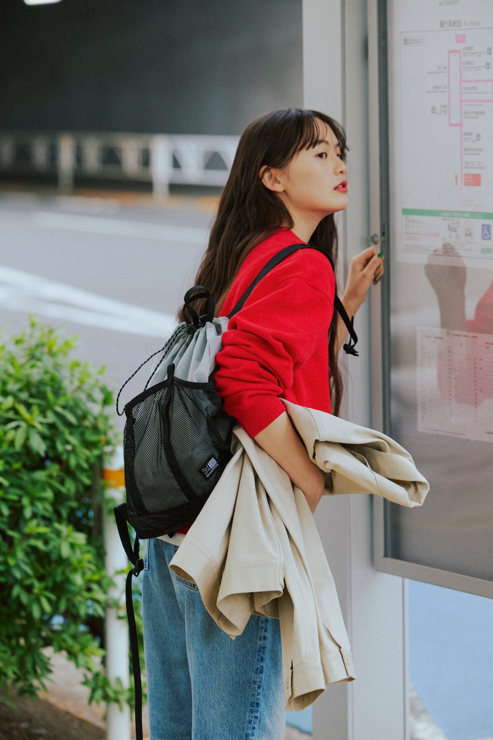 ちょっとしたお出かけに、さっと背負えて便利なナップサック。中でも選びたいのが《カリマー》の「グラブ ナップサック ミニ」。アクセスしやすいフロントの大きなメッシュポケットと背負いやすい太めのベルト、さらに軽さを備えていて優秀。赤を差し色にしたデニムスタイルに、ほどよくいまっぽさをプラスしてくれる。