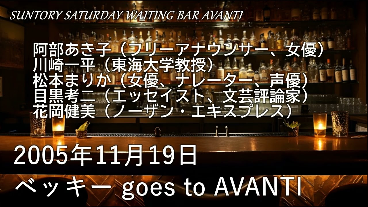 ベッキー goes to AVANTI(2005年11月19日)SUNTORY SATURDAY WAITING BAR AVANTI SUNTORY SATURDAY WAITING BAR AVANTI 「ベッキー goes to AVANTI」 放送日:2005年11月19日 出演者: 阿部あき子(フリーアナウンサー、女優) 川崎一平(東海大学教授) 松本まりか(女優、ナレーター、声優) 目黒考二(エッセイスト、文芸評論家、編集者) 花岡健美(ノーザン・エキスプレス) @サプリッ!#さらば2005年announcerAvantisuntory saturday waiting bar avantiアヴァンティアナアナ美人アバンティエッセイストエリック・ガルシアグレゴリー・スターサントリーナレーターノーザン・エキスプレスノーザンエクスプレスパプアニューギニアびじんフランス・イタリア料理用食材輸入の専門商社フリーアナウンサー三羽省吾厭世フレーバー団しん也声優女優女子アナ女子アナ美人川崎一平恐竜ハードボイルド愛しき鉤爪文芸評論家東海大学松本まりか桂望実海洋学研究科白トリュフ目黒考二県庁の星編集者花岡健美鉤爪プレイバック阿部あき子阿部哲子食材輸入会社 Write A Commentコメントを投稿するにはログインしてください。