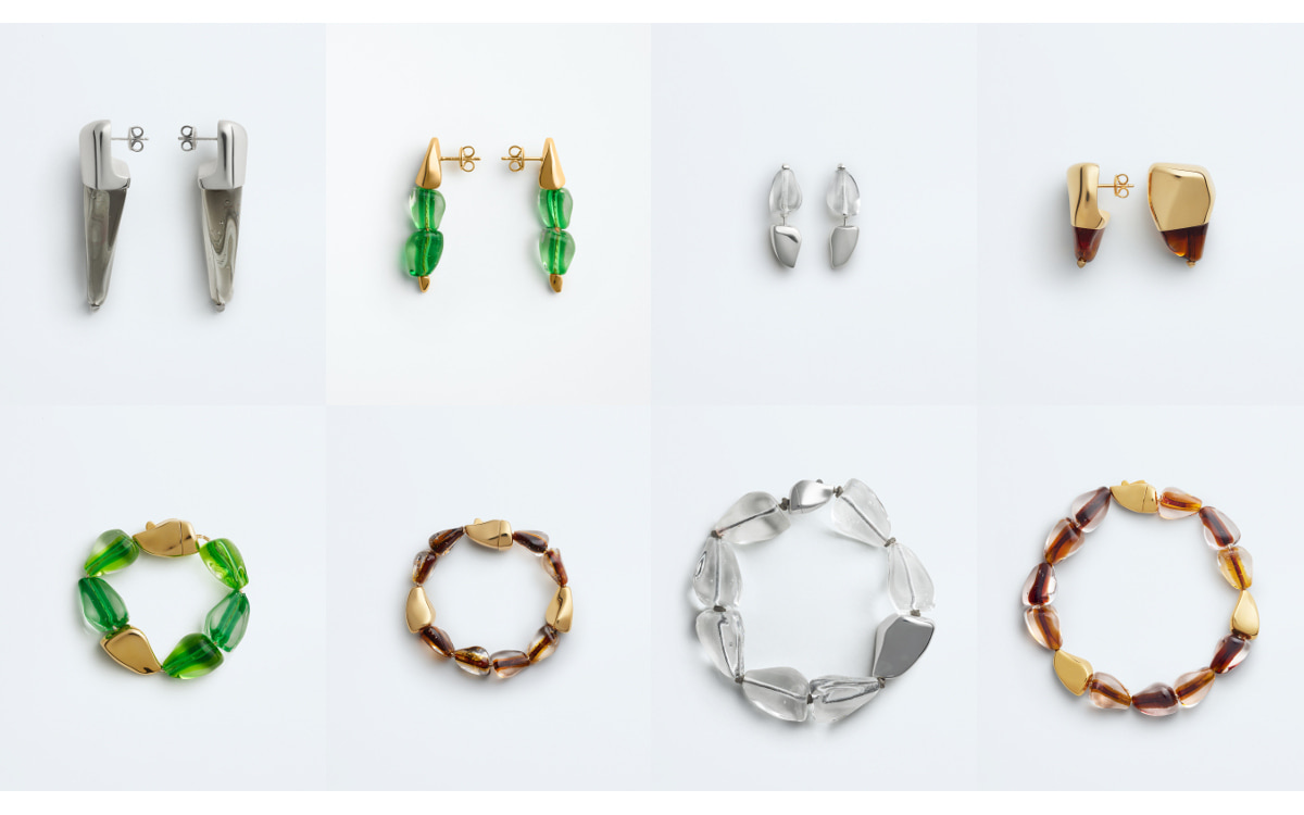 柔らかな曲線と流れるようなラインを軸に、幾何学的要素とオーガニックな動きを融合した「プリズマ」。ムラーノガラスの技法に着想を得て、内側に色彩を閉じ込めた吹きガラスを用いることで、透明感と奥行き、そして複雑な表情を持つジュエリーが完成しました。