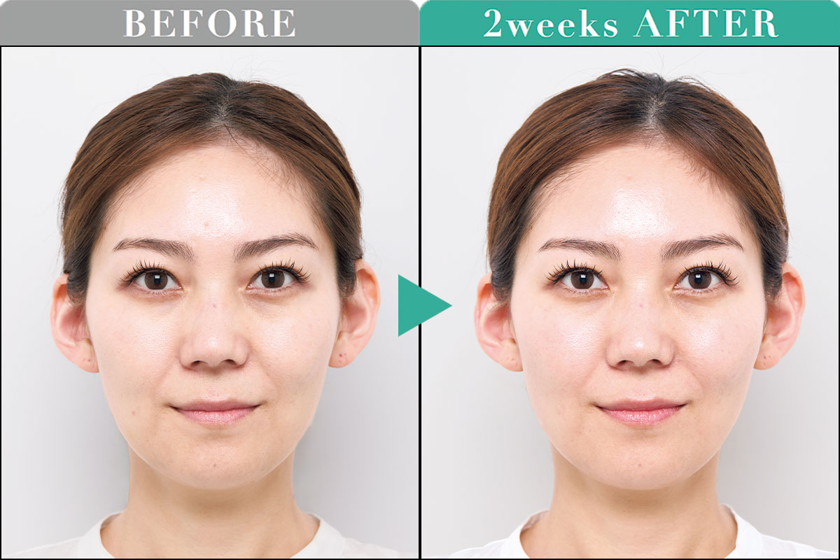 2週間の使用で顔全体のくすみ感が和らぎトーンアップ。額や頰などのツヤも増して、光を湛えた水光肌に。「顔色が暗くなったと気になっていたが明るくなり嬉しい。まだ気になるシミも今後に期待!」